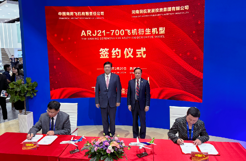 2月20日,在中國商用飛機有限責任公司(以下簡稱中國商飛)黨委書記、董事長賀東風和河南航投集團黨委書記、董事長張明超的共同見證下,河南航投集團子公司河南航投航空設備租賃有限公司(以下簡稱航投租賃)與中國商飛在新加坡航展首日簽署了《飛機購買意向書》(以下簡稱意向書),雙方就國產ARJ21-700衍生機型達成購買意向。